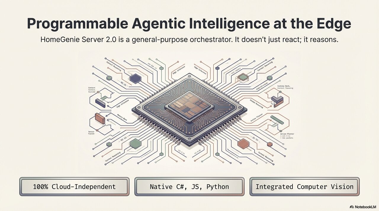 HomeGenie is far more than a simple automation hub; it is a high-performance Agentic AI Orchestrator built for the era of local intelligence. Going beyond basic triggers, it empowers you to build private, context-aware solutions that run entirely at the edge.