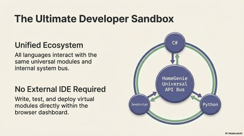 Unleash your creativity with HomeGenie's built-in development environment. Design, simulate, and control virtual modules—such as sensors or window shutters—using the powerful internal code editor. This "ultimate sandbox" allows you to prototype complex automation logic without physical hardware before deploying it to real-world devices.