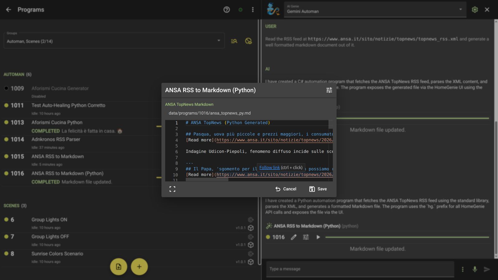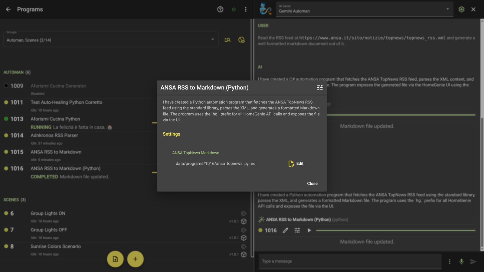 Automan (Automation Manager) represents the pinnacle of HomeGenie's agentic AI. It is not just an assistant; it is an Autonomous Orchestration Engine. Describe a complex task in natural language, and Automan will take full control of the lifecycle.